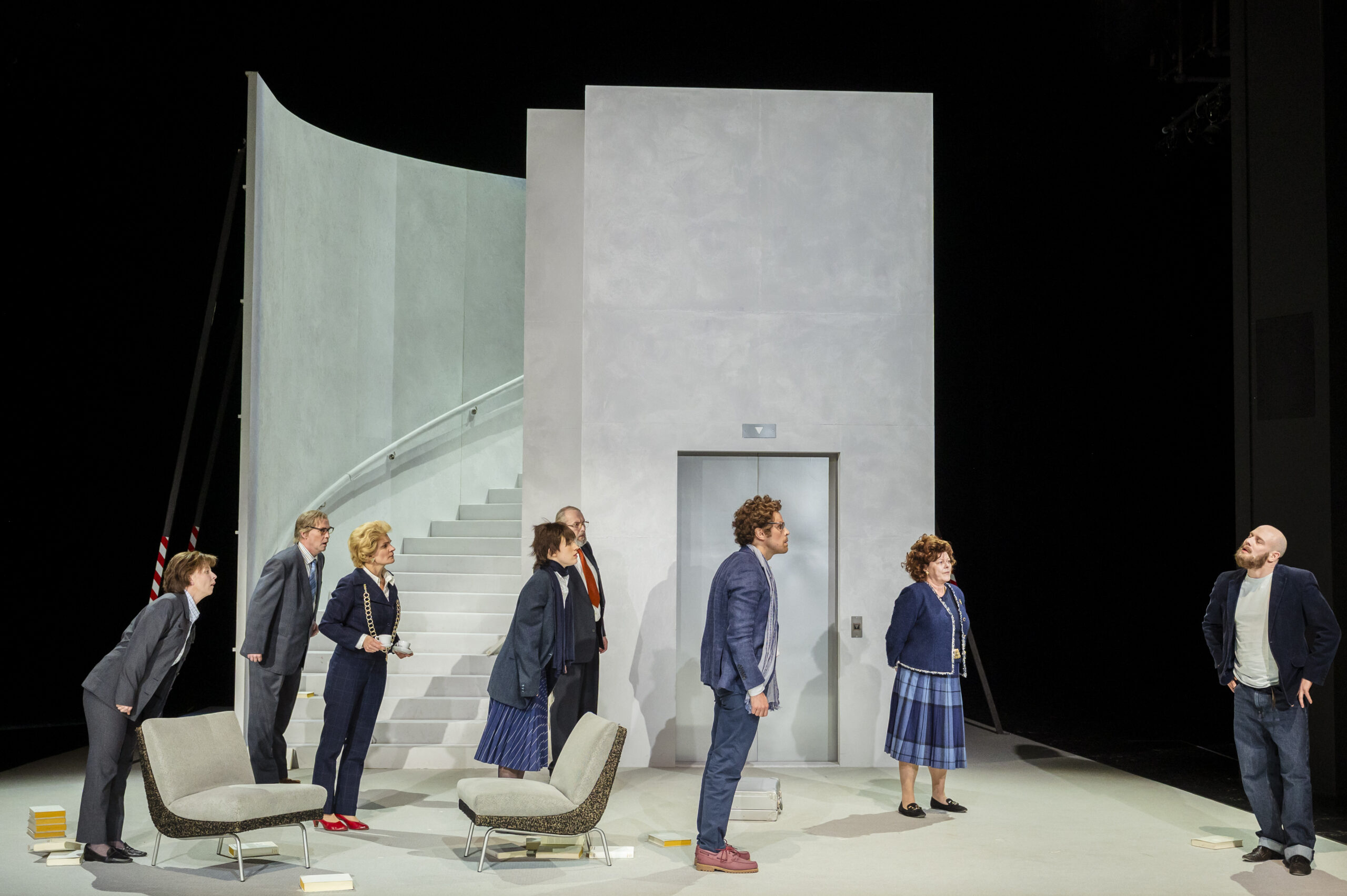 Die Komödie »Der Revisor« von Nikolai Gogol aus dem Jahr 1835 wird in der Regie von Ulrike Arnold schwungvoll und auf höchst vergnügliche Weise in die Gegenwart fortgeschrieben. Im Zentrum der Bühne (Lara Roßwag) befindet sich ein betongrauer Treppenaufgang nebst Fahrstuhltür, durch die – nach dem obligatorischen »Ping« – die Ensemblemitglieder, teils in immer wieder neuen Rollen und Kostümen (Julia Stöder), die Bühne betreten. Als vermeintlicher Revisor wird der unlängst angereiste Iwan Chlestakow ausgemacht und unter Führung der korrupten Bürgermeisterin (resolut und gewissenlos von Rebecca Klingenberg gespielt) wird sofort begonnen, diesen mit den üblichen Mitteln für sich zu gewinnen. Und alle spielen mit. Der hilflos devote, aber immer einem Kartenspiel aufgeschlossene Schulinspektor (Nikolaus Kühn), der überhebliche Richter (Florian Eppinger), die gewissenlose Direktorin der Krankenhäuser, die Postmeisterin, die Geschäftsleute und die Polizei.