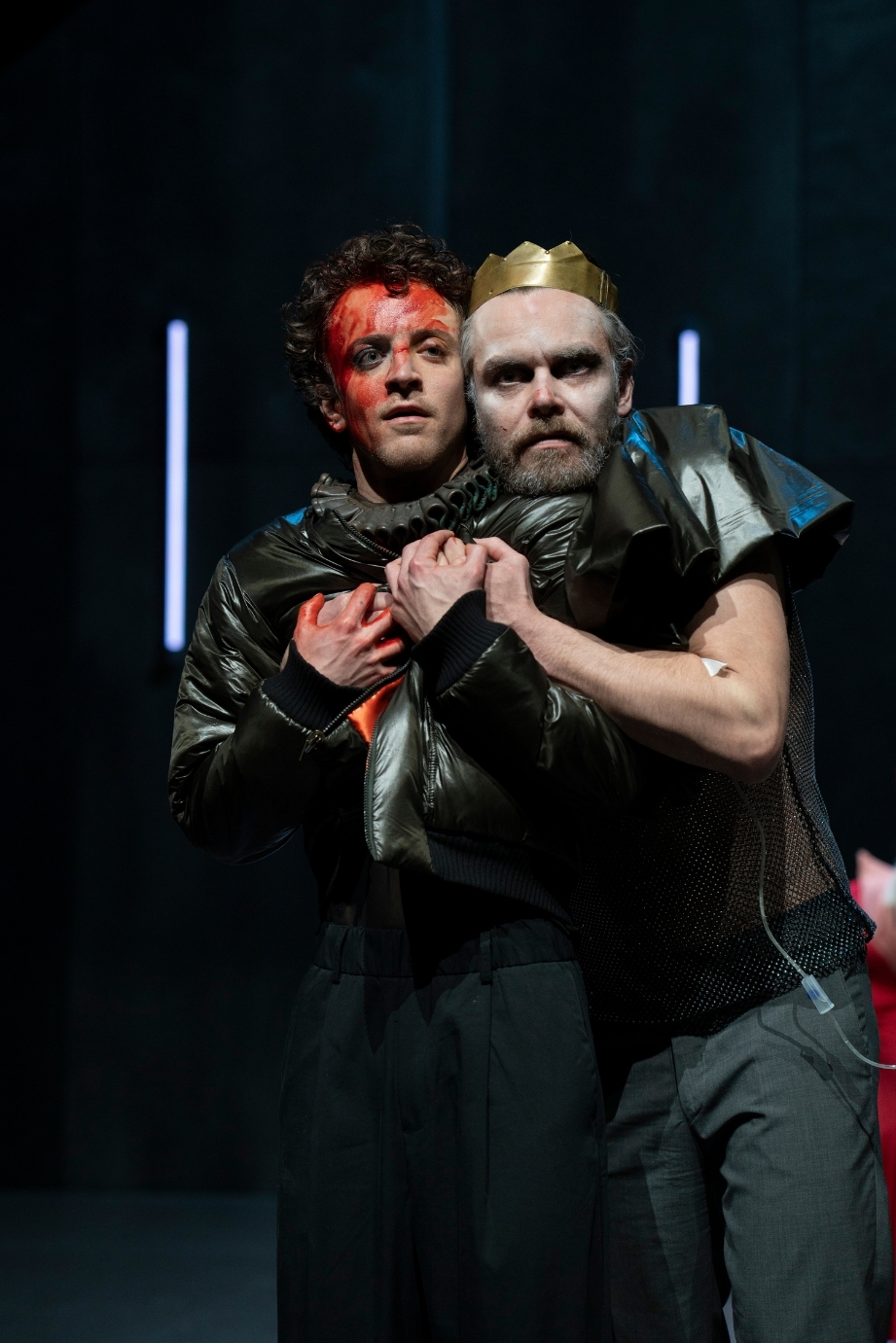 Eine steinerne Halle aus grobem Beton. Neonröhren. Verschiebbare Steinblöcke. Die Bühne des Deutschen Theaters eingerahmt von mächtigen Säulen. Düster, wuchtig, abweisend. Gleichzeitig so reduziert und leer, dass das Ensemble dieses Bühnenbild (Jörg Kiefel) immer wieder neu mit Leben sowie Kontext füllen und zum Raum von zwei Handlungssträngen wandeln kann. Die perfekte Kulisse für die fesselnde Neudichtung von Palmetshofer rund um zwei ›Söhne‹, einen Quasi-König und einen Hedonisten, die parallel in zwei Welten agieren.