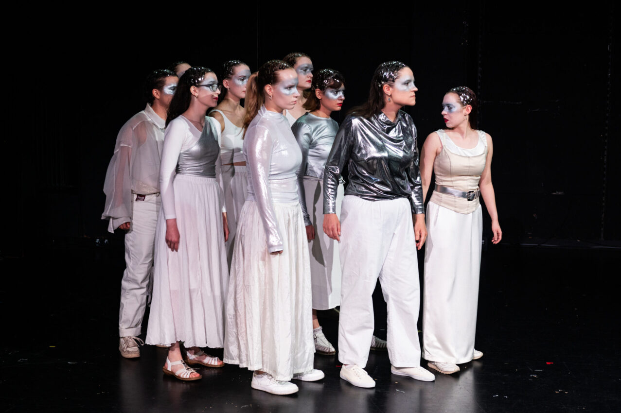 Direkt in der ersten, von schneller Musik getriebenen Szene wurde man in die Welt von »Lysistrata schreit« hineingezogen: Die Frauen treten in Streik, um sich gegen die systematische Ungleichbehandlung der Geschlechter aufzulehnen. In weiß-silbernen Gewändern und metallischem Haarschmuck wirkten die Spielenden dabei wie Kriegerinnen in ihrem Kampf gegen die Ungleichheit. Sie kritisieren, wie selbstverständlich Care Arbeit den Frauen zugeschoben wird, wie oft sie auf ihre sexuelle Verfügbarkeit reduziert werden und wie sehr diese Zustände gesellschaftlich geleugnet werden. Leises Hinterfragen der eigenen Rolle und Wünsche wechselte sich ab mit lautstarker Wut. Mal agierten sie als homogene Gruppe, mal wurden die Unterschiede der einzelnen Positionen betont: Was bedeutet es für die eigentliche Gesellschaftliche Rolle, wenn man nicht Männer liebt, wenn man Kinder hat und die Care Arbeit als erfüllend und belastend zugleich empfindet? Was, wenn der Streik auch die eigenen Bedürfnisse einschränkt?