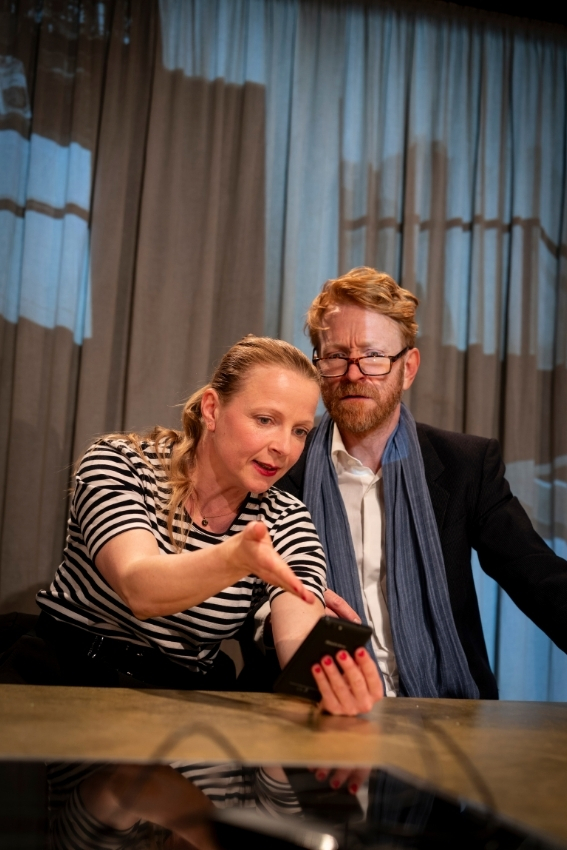 »Gelungen sind auch die Umbaupausen mit „Schauspieler-Ballett“ um die Kücheninsel. Unterstützend wirkt nicht allein hier die Musik vom französischen Chanson bis zum lässigen Pop-Hit. Auf den Leib geschnitten ist beiden die Kleidung: Sie mit langem Rock und hohen Sandalen, was zeigt, dass sie auch zu Hause auf sich achtet, während er sich in roten Jogginghosen und legerem Ringelshirt wohlfühlt (Bühne und Kostüme: Johannes Frei).«